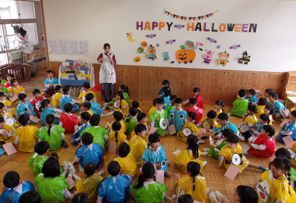 ハッピィ- ハロウィン!! こどもたちは衣装を着けてグーチョキパーでパンプキンを踊り、スタンプラリーでは1人3個のスタンプをもらいに回りました。回るときは、年長さんと小さいこどもたちのペアです。年長のお兄さん、お姉さんたちは小さい子の歩く速さに合わせて手をしっかりつないで回っていました。衣装は年少がミニオン、年中がドラえもん、年長はマイク・サリー、ひよこはかぼちゃです。スタンプが集まったペアから北棟ホールへ向かいご褒美のお菓子袋をもらい、みんなニコニコ顔でハロウィンを楽しむことができました。