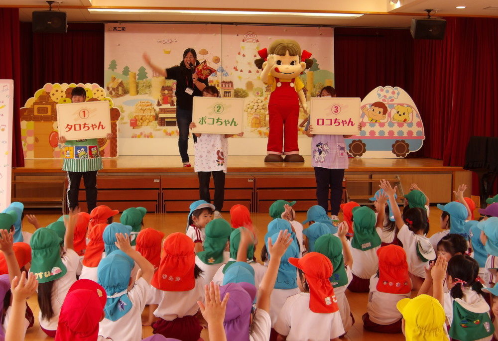 ペコちゃん号は、ペコちゃん、ポコちゃんがデザインされた、世界に一つしかないキャラバンカーです。最初にクイズ大会で、ペコちゃんに関する3問のクイズに全員が答えました。続いて、「ペコちゃんの歌」に合わせてレッツダンス♪ペコちゃんと一緒に、楽しくダンスを踊りました。最後にペコちゃんから楽しかった1日のお礼に素敵なプレゼントです。ペコちゃんからのプレゼントタイムでは、かわいらしい首振りペコちゃん人形と、全員にミルキーのお菓子をいただきました。