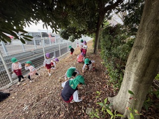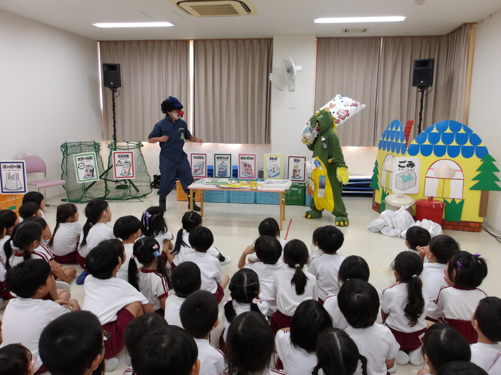NPO法人のご協力をいただき、環境教育の一環として劇を通して、こどもたちに「ポイ捨てはダメ」ということや分別収集の大切さを教えてくれました。音響効果が高く、音楽も巧みに使いこどもたちを飽きさせずに上手にお話を伝えていました。最後は、こどもたちがグループで話し合いながら実際に分別してゴミ捨てをしてみました。こどもたち参加型の楽しい劇を通して、地球のために今できることを考え学ぶよい機会となりました。