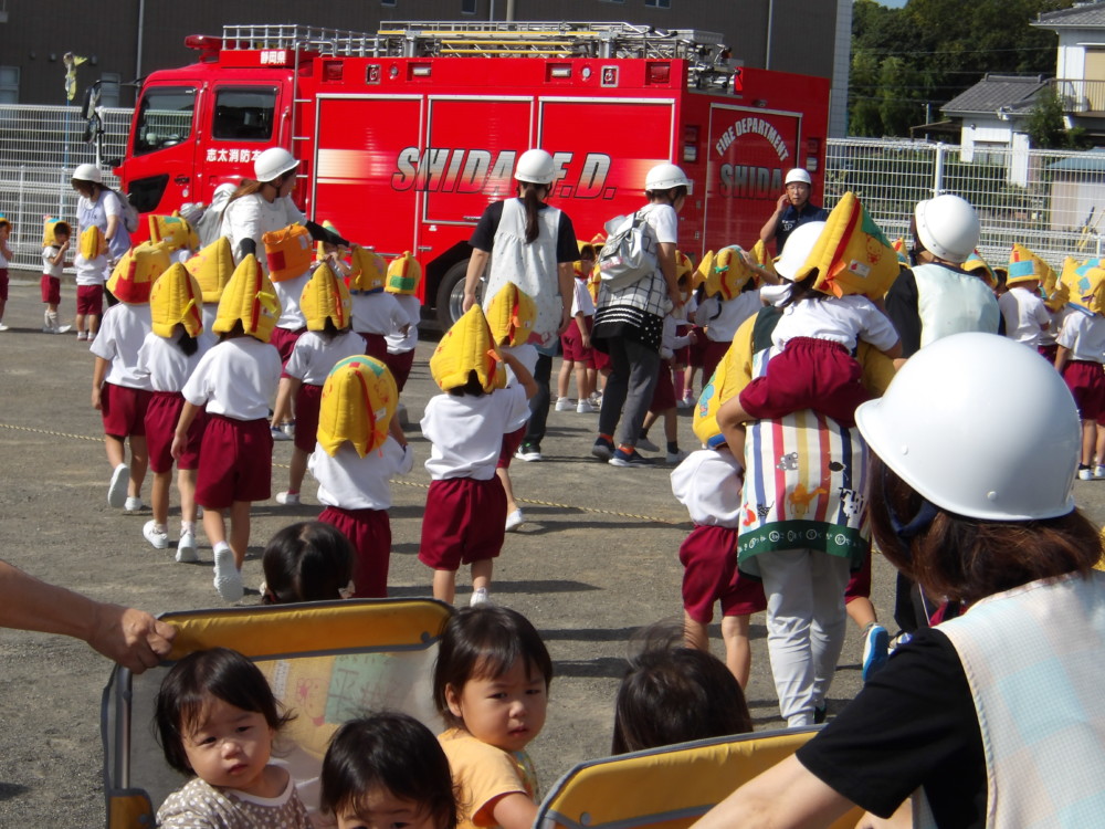 本日、火災を想定した避難訓練を実施しました。北園舎給食室で火災が発生した想定で、実際に非常ボタンが押しての訓練です。今まで園では聞いたことがない非常ベルがけたたましく鳴り響きました。こどもたちは、その音に驚いていましたが、本物のベルの音を聞いて、慣れることも大切なことです。南グランドに避難後は、藤枝南消防署から到着した消防車の紹介と、4人の消防士さんたちが実際に使っている酸素ボンベを持たせてくれたり、ヘルメットをかぶせてくれたり、消防ホース、フェイスマスクを触らせてくれたりと、普段できない貴重な体験の機会となりました。