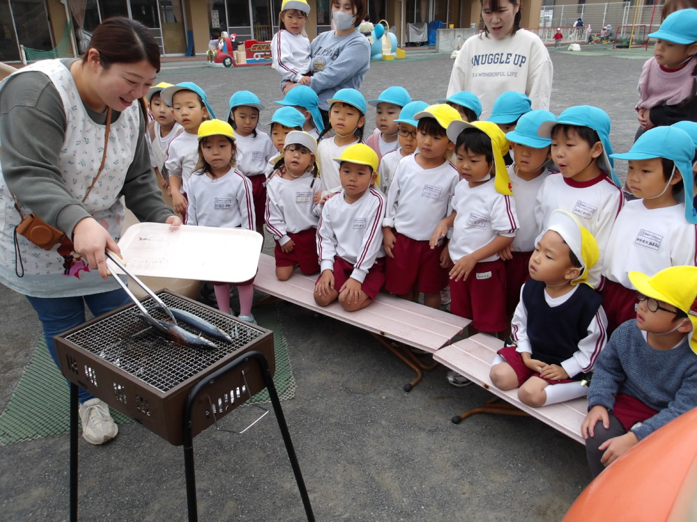 本日、年中さんは、全員でヒバリヤへ出かけ、売り場で秋刀魚を見つけてレジで代金を現金で支払い、園にもどりました。各教室でじっくりと秋刀魚を観察し、手で触ってみて魚の匂いと感触を感じ取りました。その後、園庭で4匹の秋刀魚を炭火の塩焼きにしてみんなで分けて、美味しくいただきました。炭火で焼いたことでよく焼きあがり、とっても美味しかったです。こどもたちにとっては直接秋刀魚に触るなど、貴重な体験となりました。詳しくはダイアリーをご覧ください。