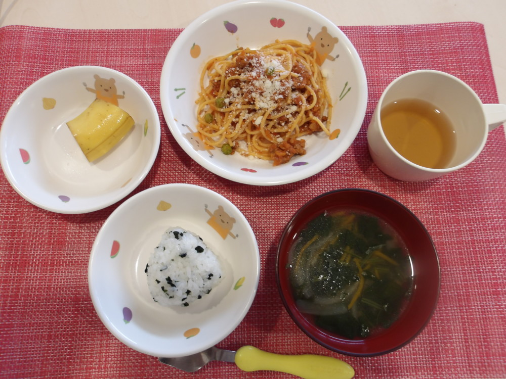おにぎり スパゲティーミートソース 具たくさんスープ バナナ