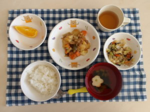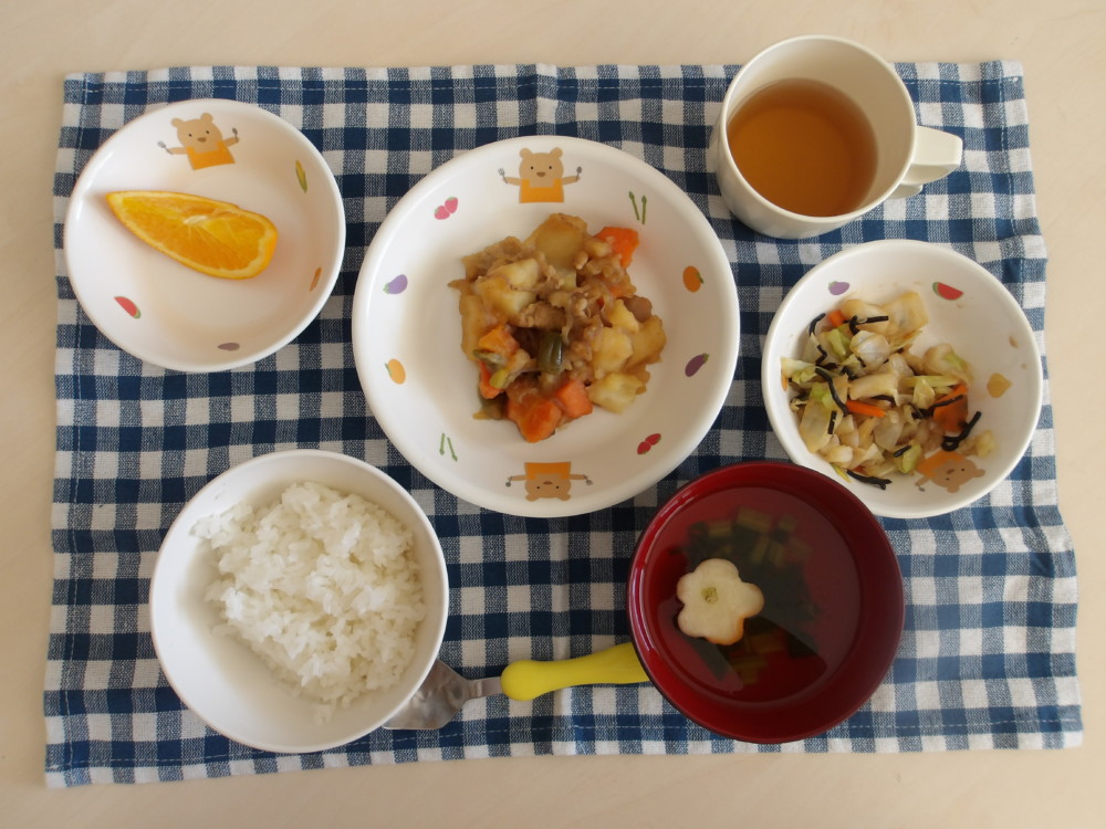 米飯 肉じゃが キャベツの昆布和え すまし汁 オレンジ