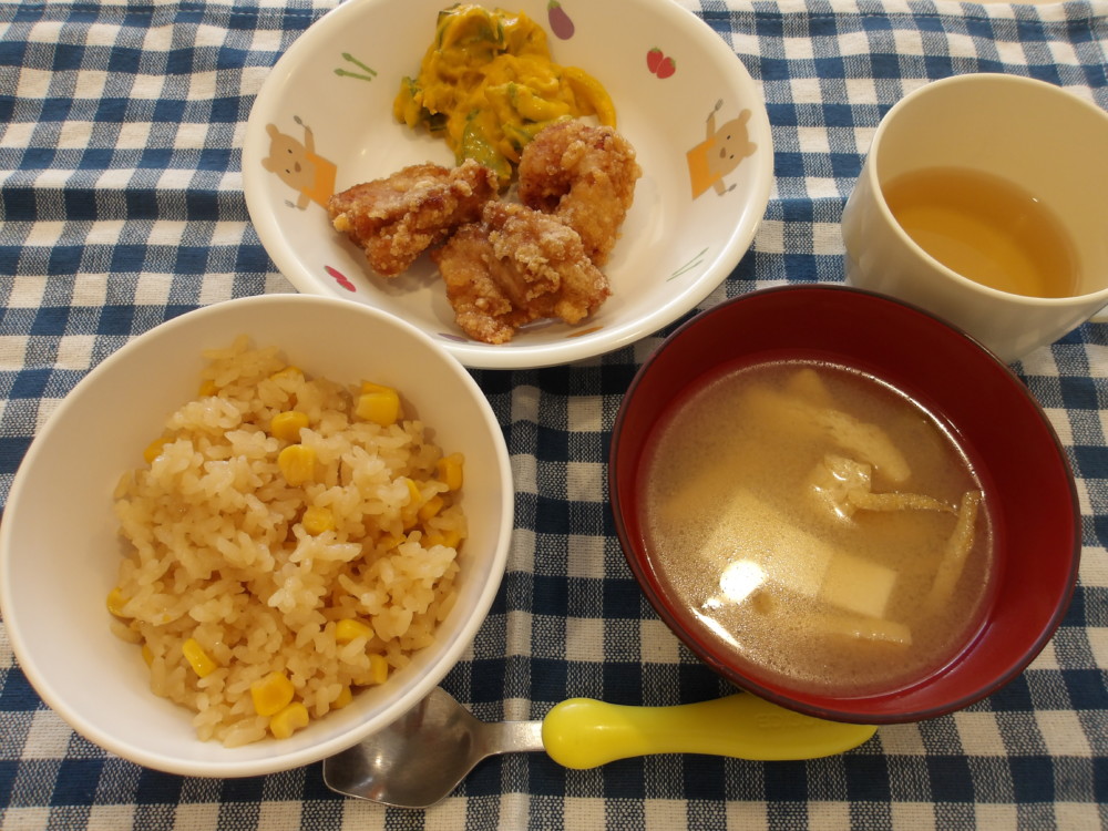 コーンバターライス 鶏の唐揚げ 南瓜のサラダ みそ汁
