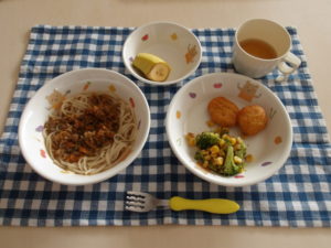 肉みそうどん チキンナゲット ブロッコリーのおかか和え バナナ