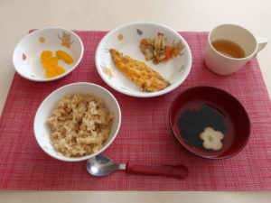 さくらご飯 魚のもみじ焼き 白菜のおかか和え すまし汁 みかん缶