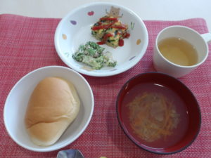 ロールパン お豆のキッシュ風 ブロッコリーのツナ和え えのきと人参のスープ