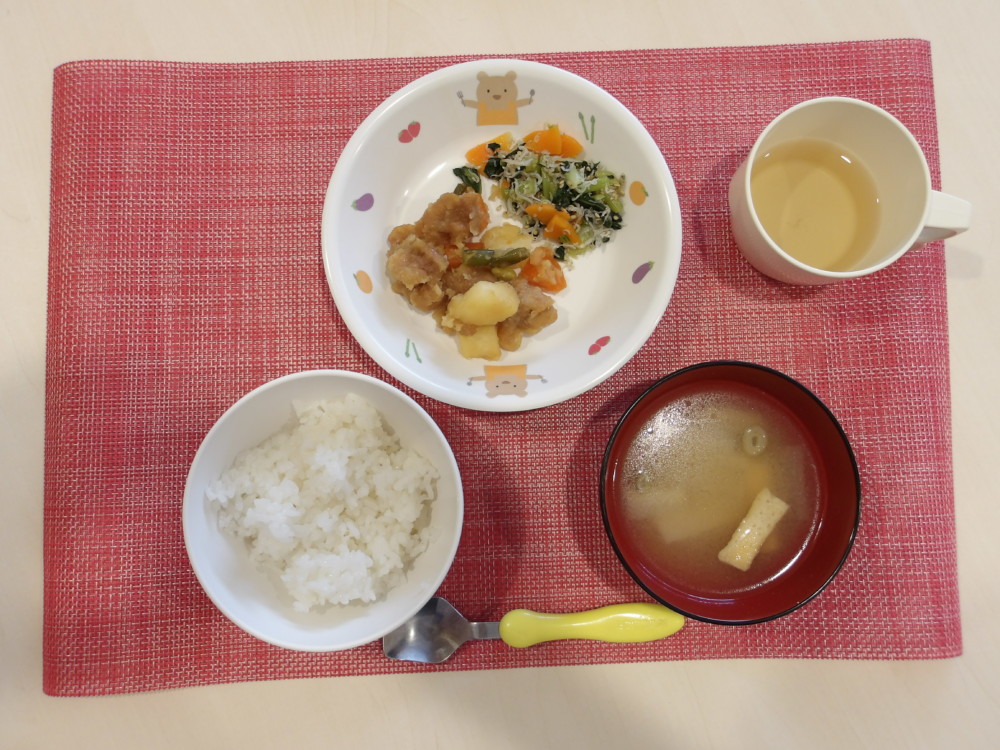 米飯 鶏肉とポテトの揚げ煮 小松菜のごま酢和え みそ汁
