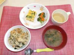 わかめご飯 長芋とベーコンのオムレツ ブロッコリーのごま和え みそ汁