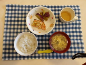 米飯 鮭のちゃんちゃん焼き さつま芋の甘煮 かき玉汁