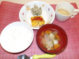 米飯 かに風味オムレツ 青菜の白和え のっぺい汁