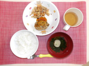 米飯 ひじき入りハンバーグ 蓮根と竹輪の金平 すまし汁