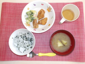 わかめご飯 鶏の唐揚げ ミモザサラダ みそ汁