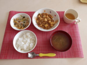 米飯 麻婆豆腐 春雨とわかめのサラダ えのきともやしのスープ