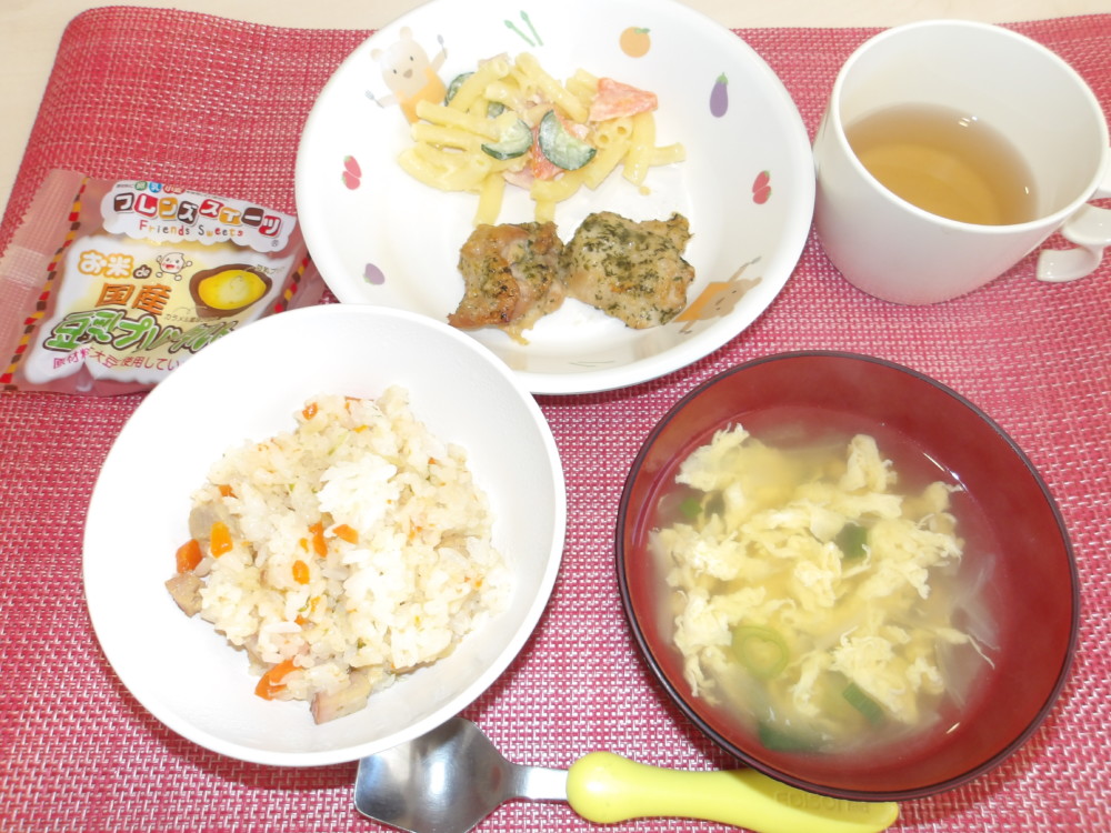 ガーリックチャーハン 鶏肉のチーズ焼き マカロニサラダ かき卵スープ