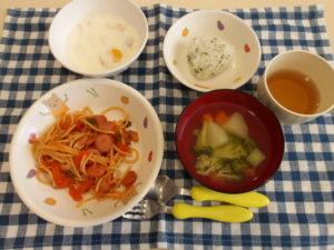 おにぎり スパゲッティーナポリタン コロコロスープ フルーツヨーグルト